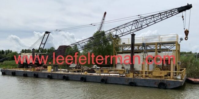 Asking Price: $235,000. Type: Crane / Spud Barge Size: 85′ x 46′ x 6′ Crane: 60 ton Bucyrus Erie 30B Boom: 120’ (2) clam buckets Raked Bow, Square Stern Plating: 3/8” Spuds: (2) – 24” x 40’ Hydraulic Pulling Unit with winches Office/Bunk Room: (1) 20’ Location: Louisiana USA Comments: Barge is ready to go…