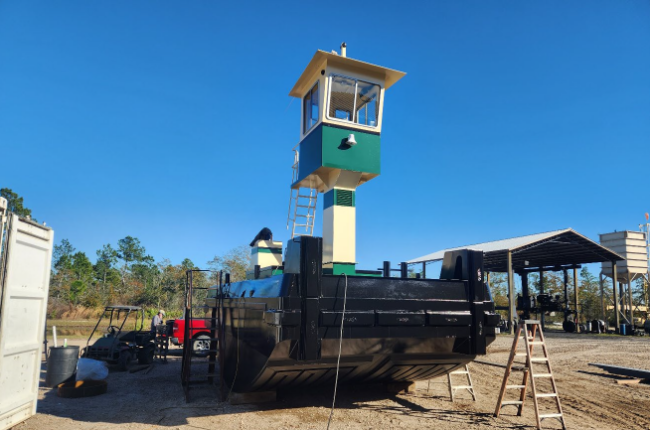 Price: $160,000. Size: 25’6” x 14’ x 5’ Type: Truckable Steel Hull Pushboat Year Built: 2011 Horsepower: 600 Push knees: (2) Main Engines: (2) – John Deere 6081 (600hp total) Engine hours: 2,150 Props: 5 blade Horsepower: 600 Shaft Seals: Dripless Rudder angle indicator: yes Electronic throttles: yes Electronics: VHF, loud hailer, nav lights, flood…